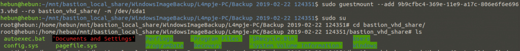 sudo guestmount –add 9b9cfbc4-369e-11e9-a17c-806e6f6e6963.vhd –ro bastion_vhd_share/ -m /dev/sda1